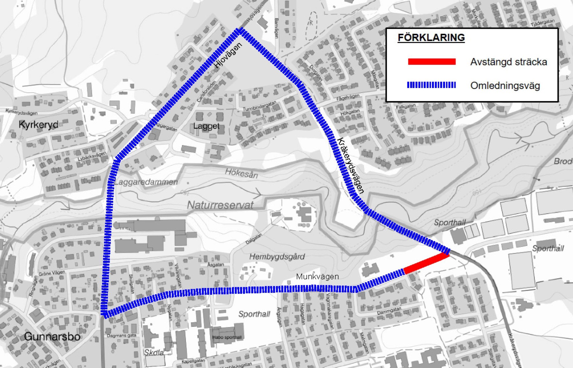 Omledning sker via Kråkerydsvägen - Hjovägen, se karta.